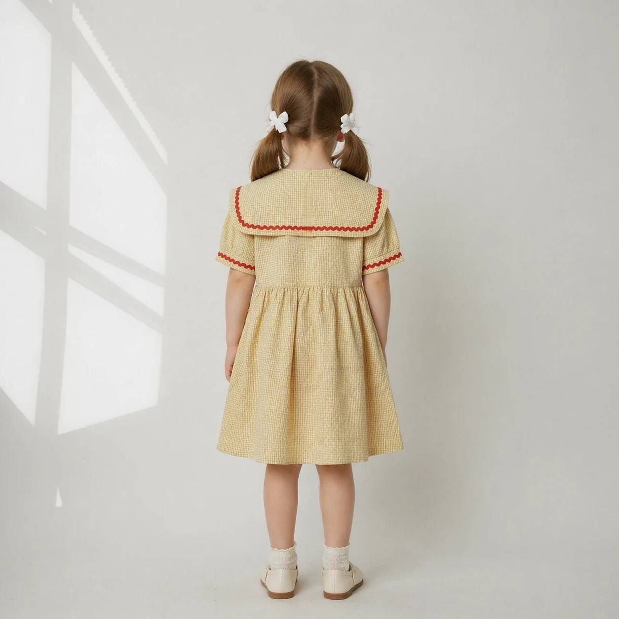 پیراهن دخترانه نخی یقه ملوانی طرح چهارخانه